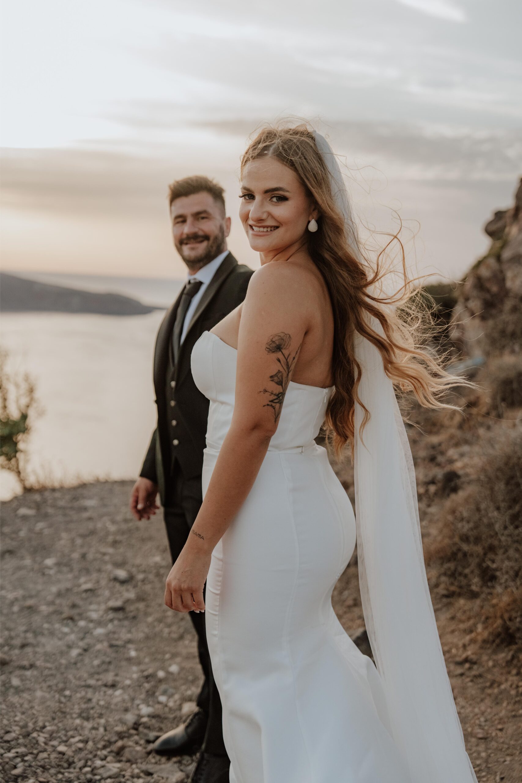 Santorini, with its iconic cliffside views and romantic atmosphere, provided the ultimate canvas for this unforgettable day. Kleopatra and Kostas chose a picturesque church that perfectly encapsulated the island’s timeless charm. The ceremony, held at church of Prophet Elias with a stunning caldera view, was bathed in warm sunlight, with the vast sky above them stretching endlessly. The serene beauty of the island mirrored their inner peace and excitement as they exchanged vows in front of their closest family and friends.